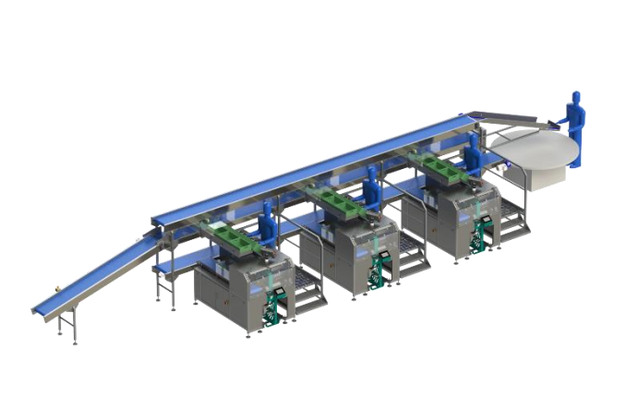 Los productos se colocan manualmente en las 10 unidades de pesaje para agrupar las hortalizas en función del peso preestablecido. La máquina de enfajado une los productos sueltos con una banda. Los productos agrupados se expulsan mediante una cinta transportadora que, si el cliente lo desea, puede conectarse a una mesa giratoria.