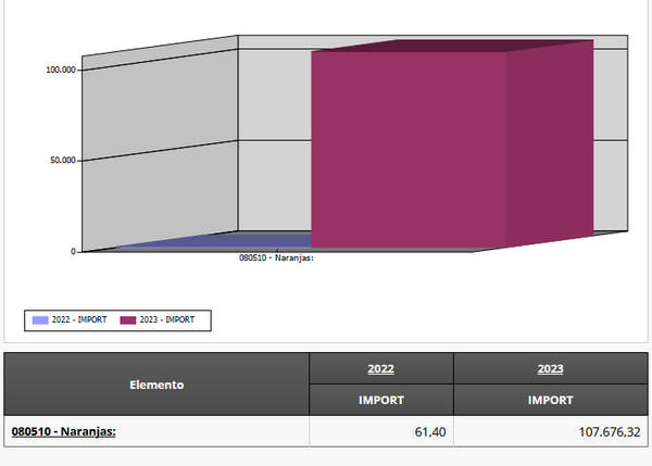 Comparando los datos de importaciones de naranjas egipcias en España entre 2022 y 2023, es innegable que las compras se han disparado de manera espectacular en solo un año.