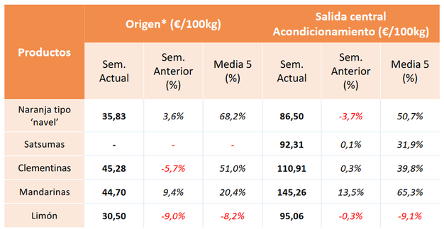 Las mandarinas marcan un incremento significativo del 9,4% en campo en la medida que van entrando en cotización variedades de un mayor valor, lo que sitúa el precio un 20,4% por encima del promedio de esta semana. A salida de central, importante rebote del 13,5%, por lo que la cotización se sitúa un 65,3% por encima de la media semanal, siendo la más alta de los últimos diez años para esta semana.