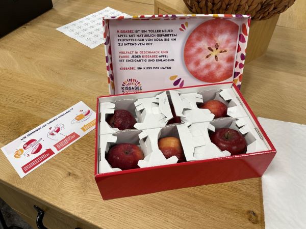 Algunas variedades de Kissabel® también pueden cultivarse de manera ecológica, pero aún están en fase de estudio y todavía no están disponibles en el mercado. "El tipo de envase más común es la bandeja de cartón de 4 o 6 manzanas. En Alemania, las manzanas también se venden en bolsas de 4 y 7 kg. Para determinadas épocas del año o eventos, como Halloween, los envases alemanes llevan etiquetas especiales.