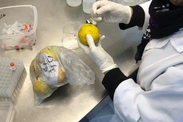 Toma de una muestra de cítricos importados en un laboratorio de referencia.
