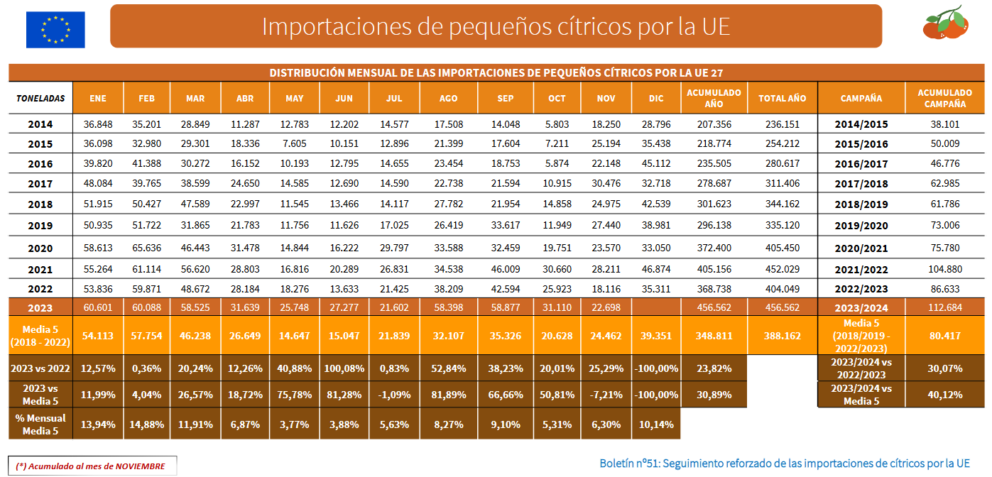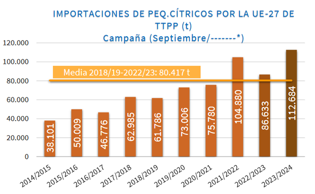 Poniendo el foco sobre las importaciones de pequeños cítricos en la UE en los tres primeros meses de campaña, desde septiembre a noviembre, los datos compartidos por el Ministerio de Agricultura, Pesca y Alimentación revelan que las compras comunitarias han totalizado 112.684 t, lo que supone un 30,1% (+26.100 t) más que el mismo periodo de la pasada campaña y un 40,1% (+32.300 t) por encima de la media de los últimos 5 años.