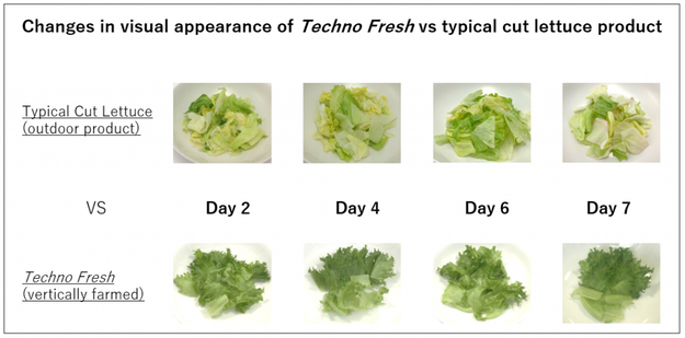 Para remediar el carácter perecedero del producto, el método de procesado de Techno Fresh utiliza lechugas sin pesticidas, cultivadas en un entorno altamente higiénico dentro de Techno Farm y lo combina con las tecnologías de procesado desarrolladas internamente que evitan el aumento de bacterias.