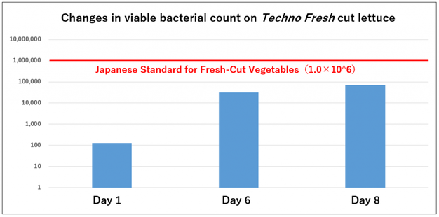 Tradicionalmente, las verduras frescas cortadas requieren un total de bacterias viables inferior a 1.000.000 para 1 g de producto. Por eso, en Japón, el periodo de conservación de la lechuga recién cortada suele ser de 3-4 días.