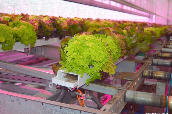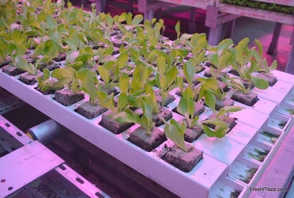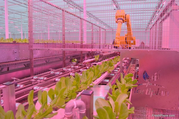 Mediante un robot, las lechugas se trasplantan a las canaletas más grandes para la segunda fase de su proceso de cultivo.