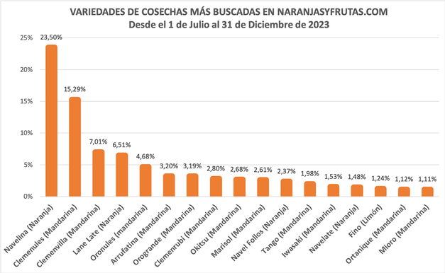 Cuando nos encontramos en mitad de la campaña de cítricos 2023/24, la plataforma Naranjasyfrutas.com, líder en España en el anuncio online de cosechas, ha compartido las tendencias de las búsquedas por parte de los comercios mayoristas que compran este tipo de cosechas a los agricultores. Así, los resultados son los que se pueden observar en el gráfico, en el que se aprecia cómo destacan Navelinas y Clemenules entre las variedades más demandadas por los comercios: