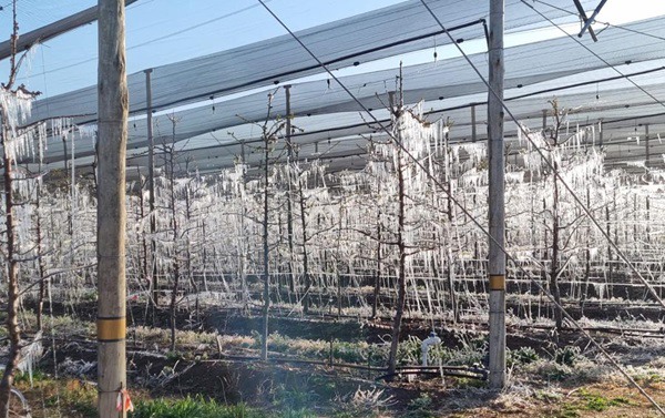 En dos ocasiones han tenido que emplear aspersores aéreos antes de episodios de heladas; todo el huerto se empapa en agua media hora antes de una helada pronosticada. El tejido de la flor está protegido contra el colapso celular por la capa de hielo, que libera calor cuando se derrite después. Kotzé señala que solo perdieron el 1% o 2% de las flores gracias a esta tecnología desarrollada en Israel.