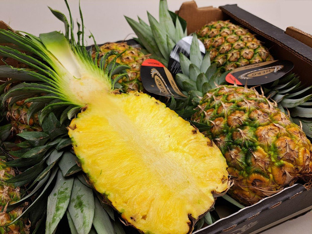 A partir de este mes, la piña premium High Color, dulce como el azúcar, está disponible en varios tamaños en las cajas abiertas NERO Premium de 11 kg. Las piñas regulares (tanto sin corona como con corona) seguirán estando disponibles bajo la marca propia DULCE Gold en las características cajas amarillas brillantes.
