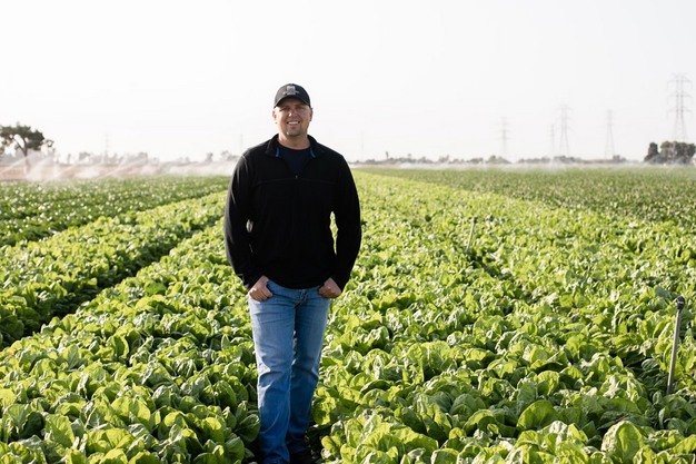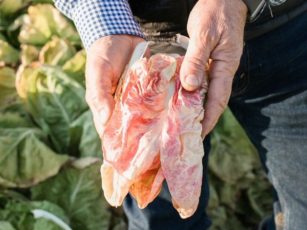 Nic Marchini de pie en un campo de radicchio rosa, que crece verde. Una vez que se eliminan las hojas exteriores, se revelan las hojas rosadas interiores.