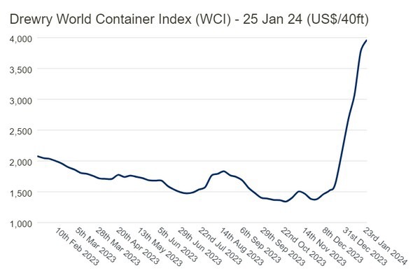 El último índice compuesto Drewry WCI de 3.964 dólares por contenedor de 40 pies es el más alto desde octubre de 2022 y es un 179% mayor que las tarifas promedio de 2019 (prepandemia) de 1.420 dólares.