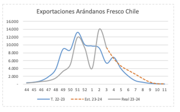 “Chile tuvo un periodo peak de exportación de arándanos frescos con volúmenes por sobre los estimados y ya a partir de la semana 4-2024 debiera verse un descenso de los volúmenes semanales”, comentó.