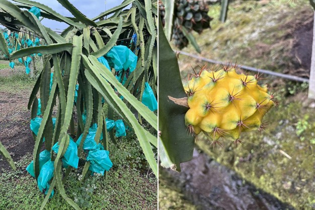 Izquierda: los agricultores utilizan bolsas de plástico para proteger las frutas. Derecha: pitahaya amarilla de Palora.