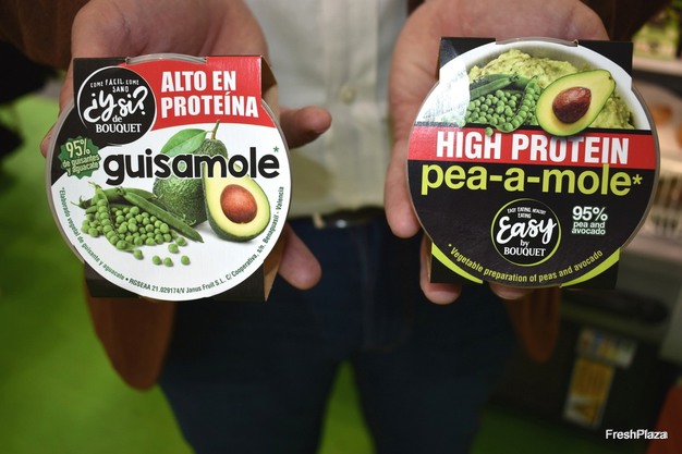 “Hemos conseguido una receta con un sabor completamente distinto, en el cual incorporamos el dulzor del guisante, modificado con limón y otros aromas, con el sabor del aguacate”, contaron Alberto Cáncer y Francisco Garrido, de Anecoop. “Se trata de un producto de un valor nutricional altísimo, con muchas más proteínas y menos grasas que el guacamole tradicional. De hecho, lo hemos incorporado al segmento de alimentos ricos en proteínas”.