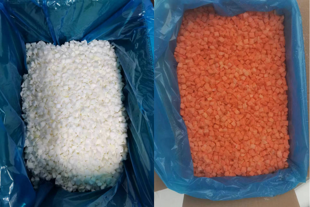 Izquierda: cebollas congeladas en dados. Derecha: zanahorias congeladas en dados.