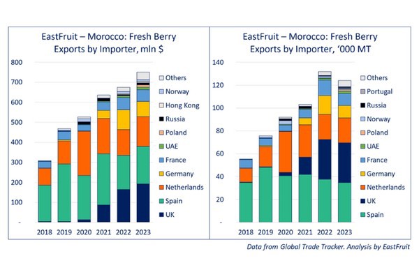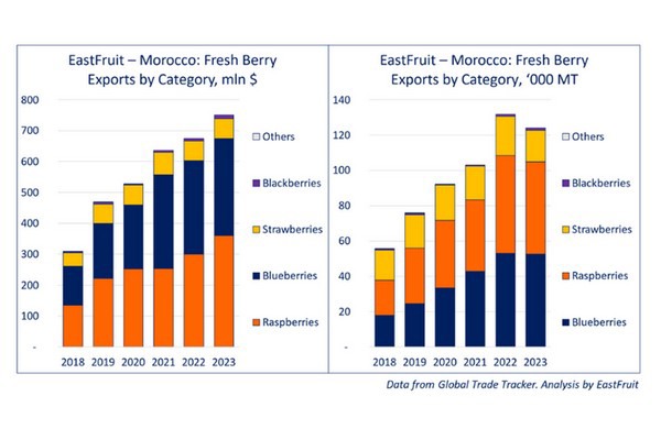 "Las berries han reafirmado su papel como pilar de las exportaciones agrícolas de Marruecos. Solo los tomates de invernadero generaron más divisas que las berries congeladas. Y también otros 83 millones de dólares provino de fresas, frambuesas y moras congeladas. A pesar de estas ganancias, 2023 planteó desafíos significativos para el sector", señala Yevhen Kuzin, analista de mercado de frutas y hortalizas en EastFruit.
