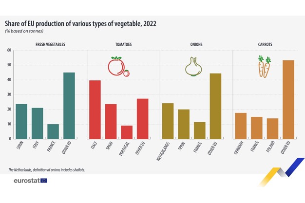 Los Países Bajos fueron el principal productor de cebollas, con casi una cuarta parte (24%) de las cebollas cosechadas de la UE, por delante de España (20%) y Francia (12%). Los principales productores de zanahorias fueron Alemania (18% del total de la UE), Francia (15%) y Polonia (14%).