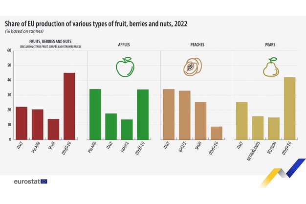 En 2022, la UE produjo 14,7 millones de toneladas de frutas de pepita (12,6 millones de toneladas de manzanas y 2,1 millones de toneladas de peras), 10,5 millones de toneladas de cítricos, 6,3 millones de toneladas de frutas de hueso (como melocotones, nectarinas, albaricoques, cerezas y ciruelas), 2,6 millones de toneladas de frutas subtropicales y tropicales (como higos, kiwis, aguacates y bananas), 1,1 millones de toneladas de frutos secos y 0,7 millones de toneladas de berries.