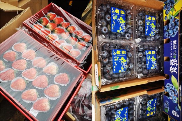 Izquierda: fresas chinas. Derecha: arándanos chinos.