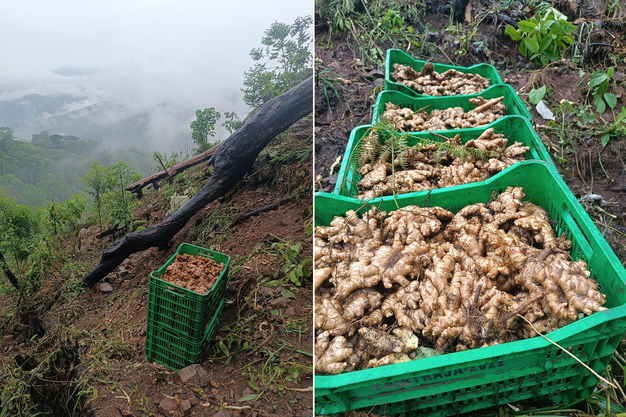 Oscar explica que el ciclo de cultivo del jengibre peruano dura ocho meses, pero puede permanecer en el suelo después. "Entonces las raíces están almacenadas, por así decirlo, aunque siguen creciendo muy poco. La mayoría de los productores peruanos prefieren conservar así el jengibre hasta la cosecha. Una vez cosechado, empieza a secarse. La desventaja de almacenarlo en el suelo es que la posibilidad de que aparezca moho es algo mayor. En China, las cosas son distintas. Cosechan una vez al año y almacenan allí el jengibre", señala.