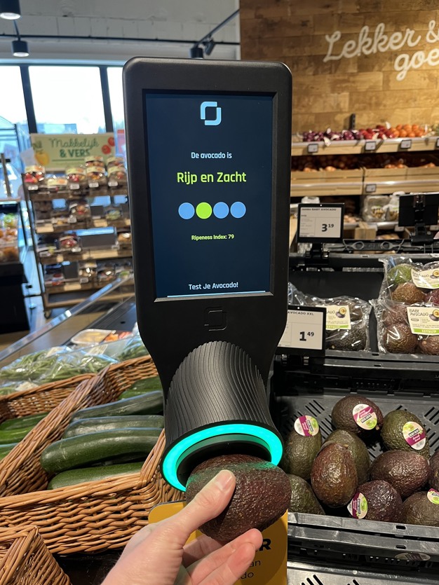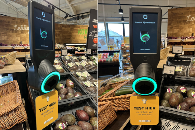 El aparato de rayos X, que se encuentra en las tiendas de Jumbo en las localidades de Ranst y Veurne, indica el estado de madurez de los aguacates. Con solo sostener el aguacate frente al escáner, el consumidor sabe en unos segundos cómo está su fruta favorita. El escáner hace una minirradiografía para comprobar los valores de azúcar, agua y almidón. Con estos datos, el aparato determina la textura del interior de la fruta.