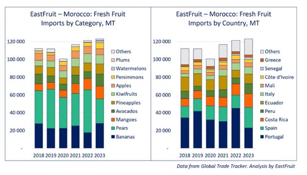 En 2023 se produjo un cambio notable, cuando las bananas se situaron a la cabeza de las importaciones de fruta de Marruecos, alcanzando un máximo de 28.000 toneladas. Aunque Marruecos cultiva aproximadamente 350.000 toneladas de bananas al año, sigue complementando su suministro con importaciones procedentes de países sudamericanos y de las islas atlánticas españolas y portuguesas. Estos dos países europeos son, de hecho, los principales proveedores de fruta fresca para Marruecos, con un suministro constante de entre el 40% y el 50% de las importaciones totales de fruta del país.