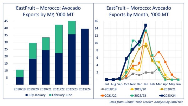 Entre julio de 2023 y enero de 2024, Marruecos logró un hito al exportar casi 40.000 toneladas de aguacates, valoradas en 120 millones de dólares, lo cual supuso un nuevo récord para ese período. Con cuatro meses más por delante –ya que en junio suele producirse una pausa en las exportaciones–, aunque las cifras de febrero a mayo de 2024 desciendan a los niveles más bajos de los últimos años, se espera que la cifra total de exportaciones de la campaña 2023/24 no tenga precedentes. Los datos preliminares de la Asociación Marroquí del Aguacate lo corroboran, sugiriendo que las exportaciones podrían superar las 60.000 toneladas en el conjunto de la campaña.