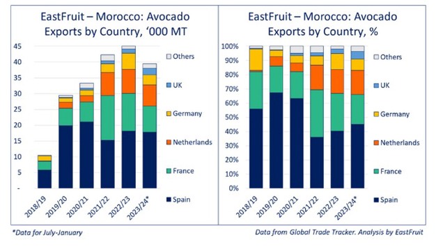 El mercado marroquí de exportación de aguacates se enfrenta actualmente a la limitación de depender de un puñado de destinos. A pesar del aumento de la oferta, los exportadores marroquíes se dirigen principalmente a cuatro países de la UE: España, Francia, Países Bajos y Alemania, siendo los tres primeros los que más aguacates marroquíes reexportan. El quinto mayor importador, el Reino Unido, se encuentra fuera de la UE.
