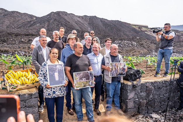 Ayer jueves se celebró el acto de presentación de la siembra de una finca afectada por el volcán Tajogaite organizado por Europlátano, el cual estuvo presidido por Fernando Clavijo, presidente de Canarias, así como la visita a las obras de recuperación de diversas fincas cubiertas por las coladas volcánicas en septiembre de 2021.