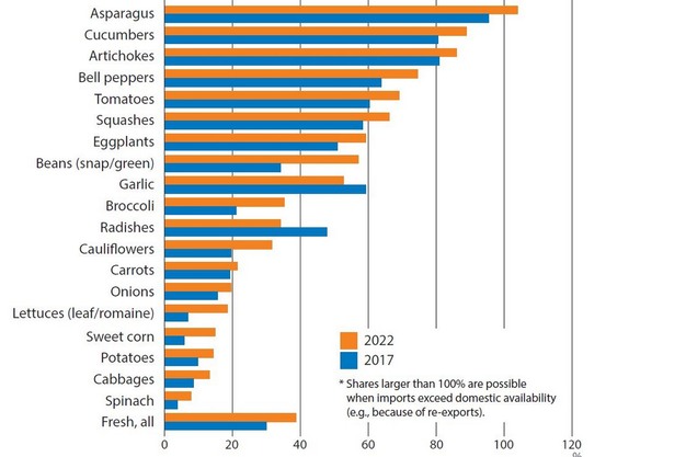 Figura 2: Cuota de las hortalizas importadas en el total de hortalizas frescas disponibles en EE. UU., 2017 vs. 2022.