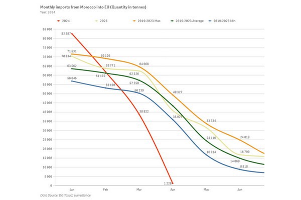 La línea roja muestra las importaciones desde Marruecos en 2024. La línea verde, el promedio de los últimos cinco años.