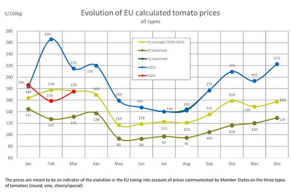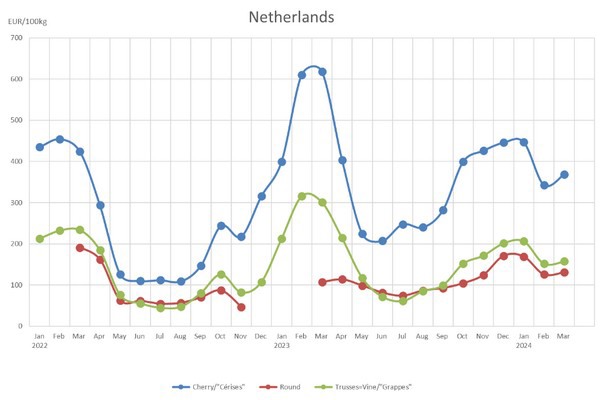 El precio medio de los tomates sueltos holandeses alcanzó los 1,31 €/kg en marzo, un 23% más alto que la media de marzo de 2023, un año con precios, por lo general, notablemente altos.