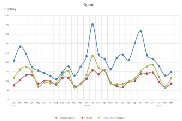 En comparación con el promedio del último lustro, el precio de los tomates cherry y de las especialidades del mes de marzo de 2024, situado en 3,69 €/kg, fue el más alto.