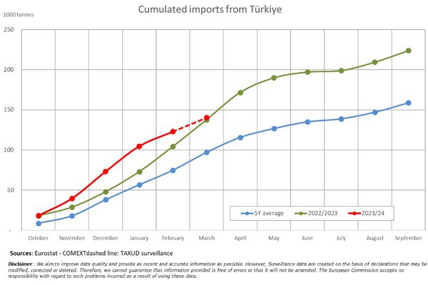 Las importaciones desde Turquía estuvieron por encima del promedio de los últimos cinco años, aunque disminuyeron en el mes de marzo. "La menor producción europea de tomate ha brindado una oportunidad a los tomates turcos", dice Emel Esin Keskin, propietaria de Esin Tarim.