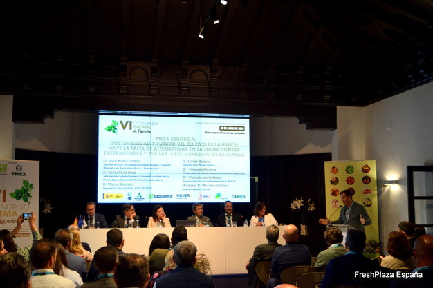 En la segunda mesa redonda se analizó la sostenibilidad y el futuro del cultivo de la patata ante la falta de alternativas en la lucha contra las enfermedades y plagas, tratando el caso concreto de la semilla; en ella participaron José María Cobos, subdirector general de Sanidad e Higiene Vegetal y Forestal del Ministerio de Agricultura, Pesa y Alimentación; Rafael Sánchez, jefe de servicio de Sanidad Vegetal de la Consejería de Agricultura, Pesca, Agua y Desarrollo Rural; Marco Román, presidente del sector Patata de Asociafruit; Javier Boceta, director general de Meijer Ibérica; Yolanda Medina, vicepresidenta interprofesional de Patata Castilla y León, y Victoria de la Haza, responsable de Asuntos Reglamentarios de AEPLA.