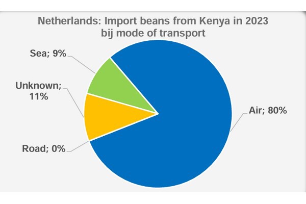 El año pasado, Países Bajos importó productos de Kenia valorados en casi 700 millones de euros. Las flores cortadas fueron el grupo de productos más importante, con casi 375 millones de euros, seguido por las frutas frescas, con 115 millones de euros. El valor de las importaciones de hortalizas frescas de Kenia superó los 30 millones de euros. La mayoría de las flores cortadas kenianas llegaron por aire, mientras que la mayoría de aguacates lo hicieron por mar. Las judías de Kenia llegan principalmente por aire. Los productos agrícolas suponen un porcentaje importante de las exportaciones de Kenia. En total, en 2022, el país exportó bienes valorados en más de 7.000 millones de euros. Los productos agrícolas constituyeron una parte importante, con 4.000 millones de euros. El valor de las exportaciones de frutas y hortalizas (frescas y procesadas) se situó en 575 millones de euros.