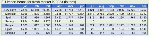 Además de los aguacates, en lo que respecta a la importación de productos kenianos en la UE, solo las judías gozan de cierto peso. Hablamos de judías para el mercado fresco. En 2023, la UE importó 122.000 toneladas de Kenia. Marruecos y España son mucho más importantes en este mercado y también lo son las judías senegalesas. El producto keniano está disponible durante todo el año, al igual que las judías marroquíes, pero en el período de julio a septiembre, la oferta es menor. Las judías senegalesas solo están en el mercado desde finales de diciembre hasta abril. Las judías egipcias están principalmente disponibles de noviembre a mayo.