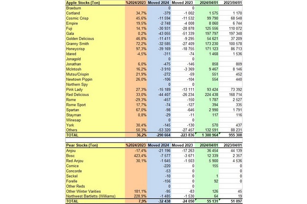 En EE. UU., las existencias de manzanas a 1 de abril de 2024 se situaban en 290.664 t (un 36,2% más que en 2023), y las de peras también subieron, con 32.438 t (un 7,9% más que en 2023). Las existencias de manzanas Fuji subieron un 14,1%, las Gala un 0,2% y las Golden Delicious un 46,8%, mientras que las Granny Smith aumentaron un 72,2%.