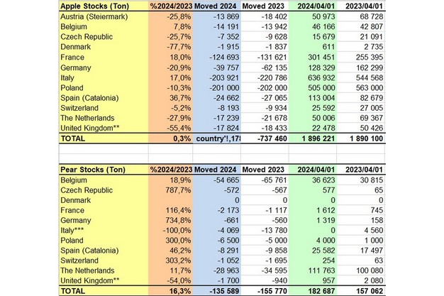 WAPA, la Asociación Mundial de la Manzana y la Pera, ha publicado las cifras de existencias de manzanas y peras a 1 de abril de 2024. Las cifras muestran que en Europa las existencias de manzanas aumentaron ligeramente en un 0,3% en comparación con 2023 hasta alcanzar -674.616 t, mientras que las existencias de peras aumentaron un 16,3% hasta alcanzar 135.589 t. En EE. UU., las existencias de manzanas a 1 de abril de 2024 se situaban en 290.664 t (un 36,2% más en comparación con 2023), y las de peras también aumentaron hasta situarse en 32.438 t (un 7,9% más que en 2023).