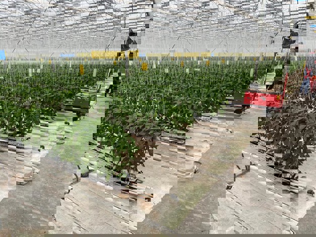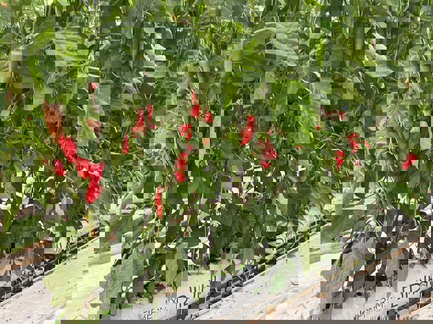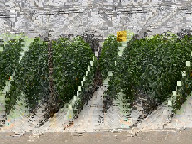 Ricardo añade: "Los pimientos prosperan en invernaderos con 60% de humedad relativa, 400 a 600 ppm de CO₂ y calefacción por tubos". Ricardo dice que en términos de densidad, colocan 3,2 plantas por metro cuadrado. "Y en cada planta tenemos 3 tallos, lo que da un total de 9,6 tallos por metro cuadrado".