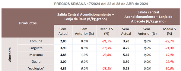 Consultando los precios actuales de la semana 17 de 2024 compartidos por el MAPA, correspondientes a las lonjas de Reus y de Albacete, todas las variedades registran, de hecho, descensos de precios que superan en la mayoría de los casos el 20% respecto a la media de los últimos 5 años, con una caída que se sitúa hasta en un 30% para la almendra ecológica.
