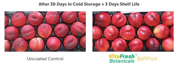 Un ejemplo concreto de esta solución es VitaFresh™ Botanicals SoftFruit. "Se trata de un recubrimiento poscosecha ideal para productos con piel sensible, como las frutas de hueso. Formulado a partir de girasol (Helianthus sp.), ayuda a reforzar la protección de las frutas de forma natural, creando una 'doble piel' que contribuye a mantener la frescura a lo largo de toda la cadena de suministro. Una de sus principales ventajas es la reducción de la pérdida de peso, con resultados del 10% y 5% para nectarinas y ciruelas respectivamente, tras 20 días de almacenamiento. También mejora el aspecto externo de la fruta, reduciendo el desarrollo de enfermedades de la piel. Además, esta solución cubre la fruta de forma uniforme, con una formulación altamente concentrada que ofrece eficacia operativa, con más toneladas tratadas por litro utilizado. VitaFresh Botanicals SoftFruit también está certificado como vegano por la Unión Vegetariana Europea", explica la empresa.