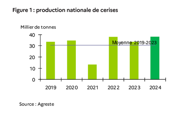"A 1 de mayo de 2024, la producción de cerezas para la temporada de 2024 se estima en 37.700 toneladas, un aumento del 12% respecto a 2023 y un 23% más que la cosecha media de 2019 a 2023", según Agreste, el departamento de estadísticas del Ministerio de Agricultura francés. Este aumento de la producción afectará a todas las regiones productoras.