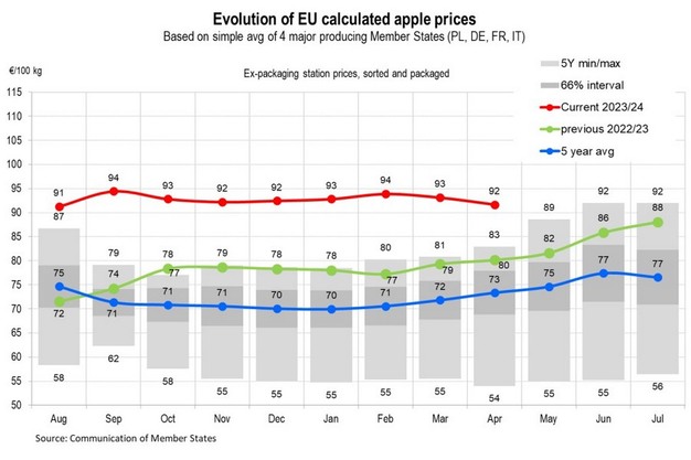 La UE calculó los precios de las manzanas en abril –basándose en el promedio simple de los cuatro principales Estados miembros de la UE–, que se situó en 92 € /100 kg, 1 € menos en comparación con el mes anterior.