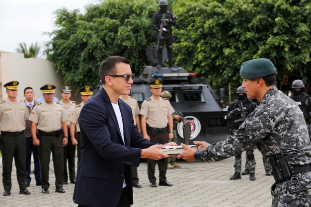 El presidente de Ecuador, Daniel Noboa, con las fuerzas de seguridad. Foto: Boletín del Gobierno de Ecuador.