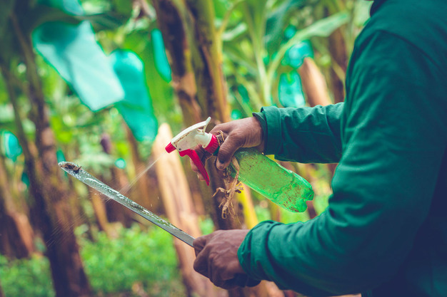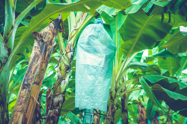 Los racimos de bananos son protegidos del viento y de los insectos.
