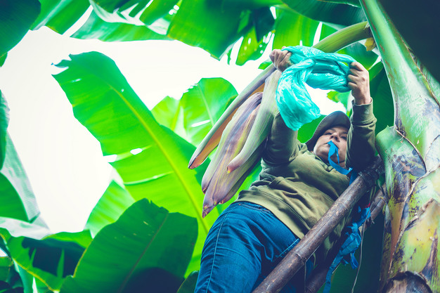 Un joven racimo de bananos se envuelve con una funda que lo protege del viento y de los insectos.