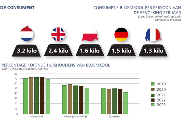 En 2023, el consumo total holandés fue menor que en el año anterior debido a una oferta más escasa, especialmente de coliflor de España y Francia, pero en los cinco años anteriores hubo crecimiento anual. El cultivo en Países Bajos se realiza principalmente en Noord-Holland (West-Friesland), donde la distribución se orienta principalmente al mercado interno.