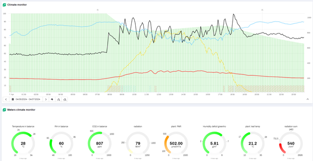 Ejemplo de monitor climático en LetsGrow.com. Las barras verticales verdes muestran el porcentaje de clima en equilibrio. Los parámetros climáticos se muestran con líneas de distintos colores, radiación (W/m2) (amarillo), temperatura del invernadero (°C) (rojo), humedad relativa del invernadero (%) (azul) y CO2 (ppm) (negro).