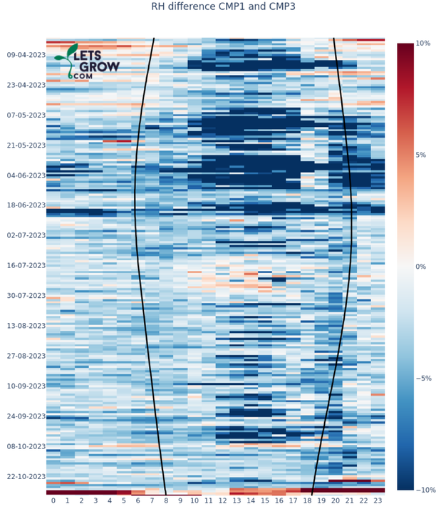 Diferencia de humedad relativa entre los compartimentos 1 (sin nebulización) y 3 (con nebulización) durante abril y octubre de 2023. Los colores azul oscuro indican que el compartimento 3 tenía una humedad superior en un 2-10% en comparación con el compartimento 1. El gráfico se elaboró con la herramienta de escaneo de estrategias de LetsGrow.com.