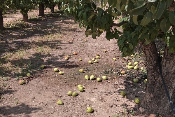 "El año pasado, con las pérdidas que causó el reventón térmico faltó pera y no pudimos vender toda la que habríamos querido al mercado italiano, pero esperamos que este año la DANA nos respete y la campaña no se tuerza en estos últimos días. Aunque sería necesario que, sin provocar daños, también cayera agua en esta zona, donde las viñas y los olivos no van a dar fruto y están muriendo por falta de agua; en mi vida, nunca había visto una situación como la que estamos pasando en este momento".